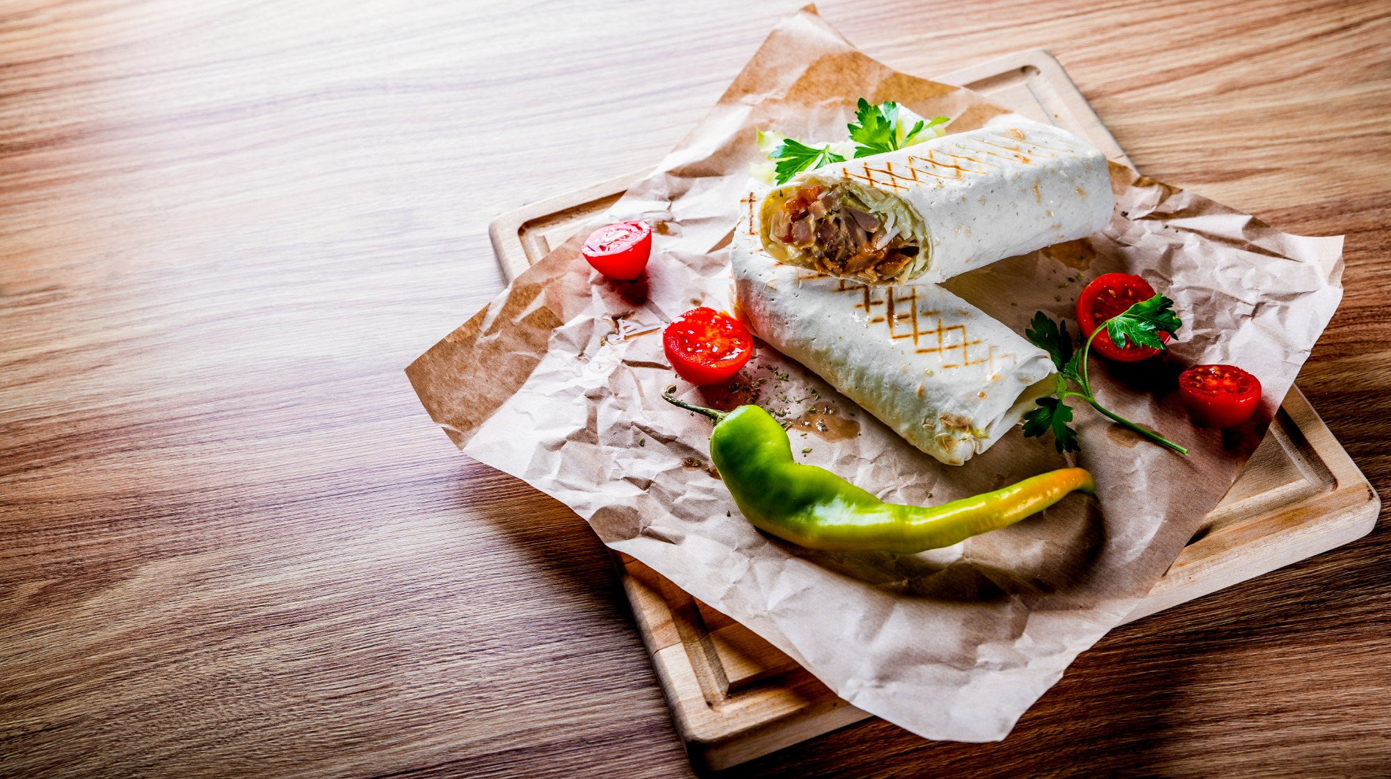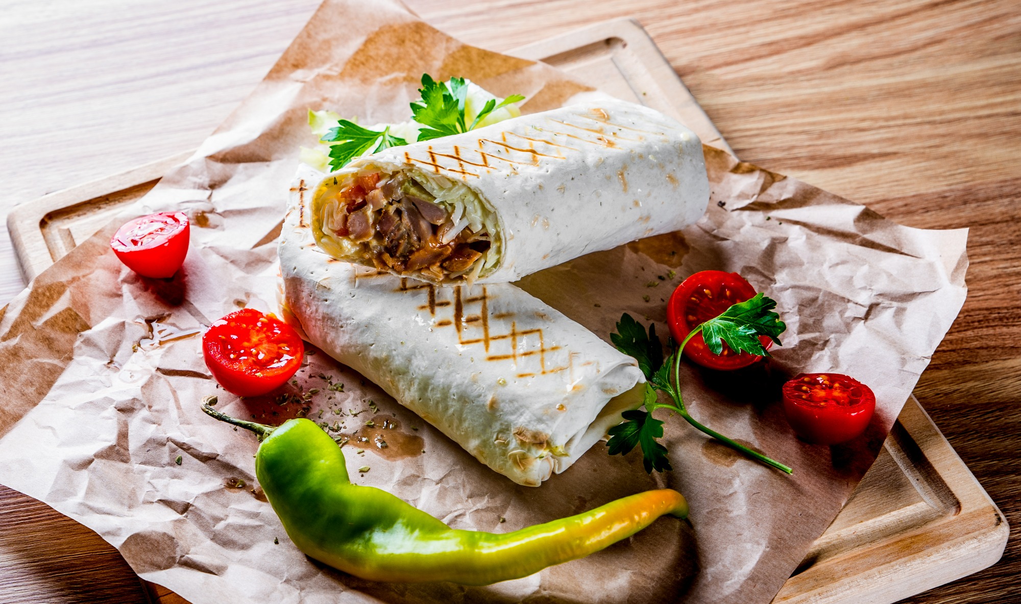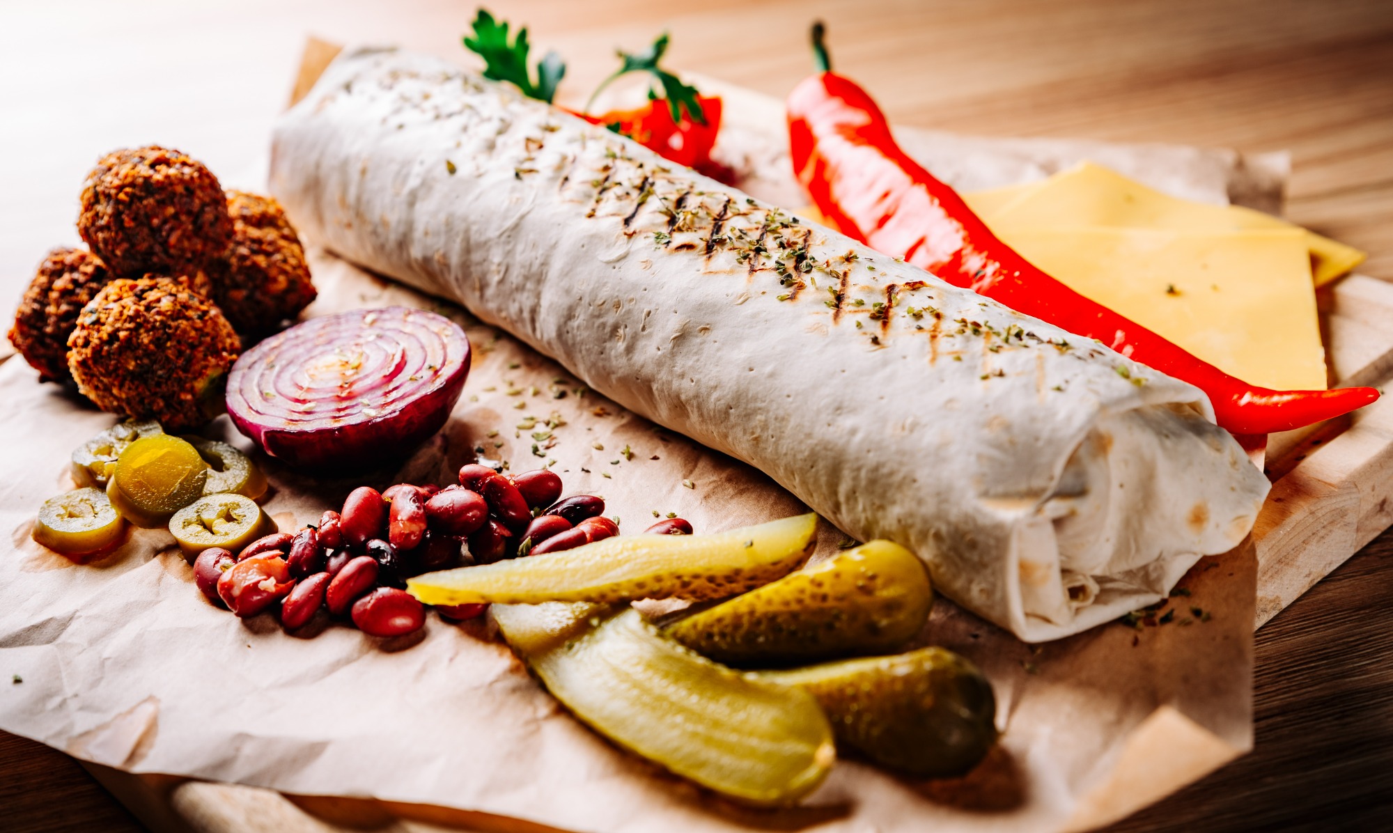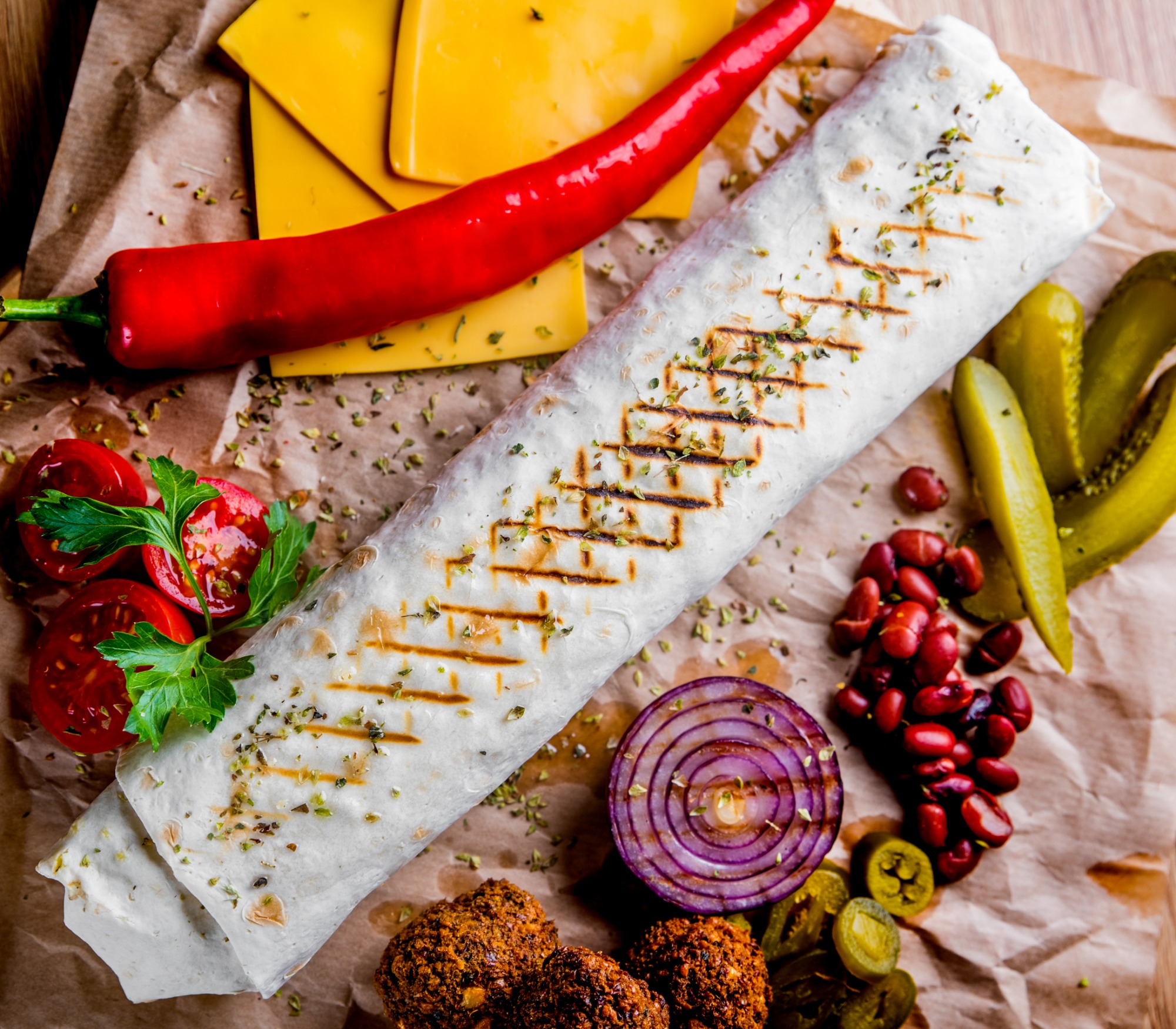ok. 180g mięsa, sałata lodowa, pomidor, ogórek, cebula, sos do wyboru -